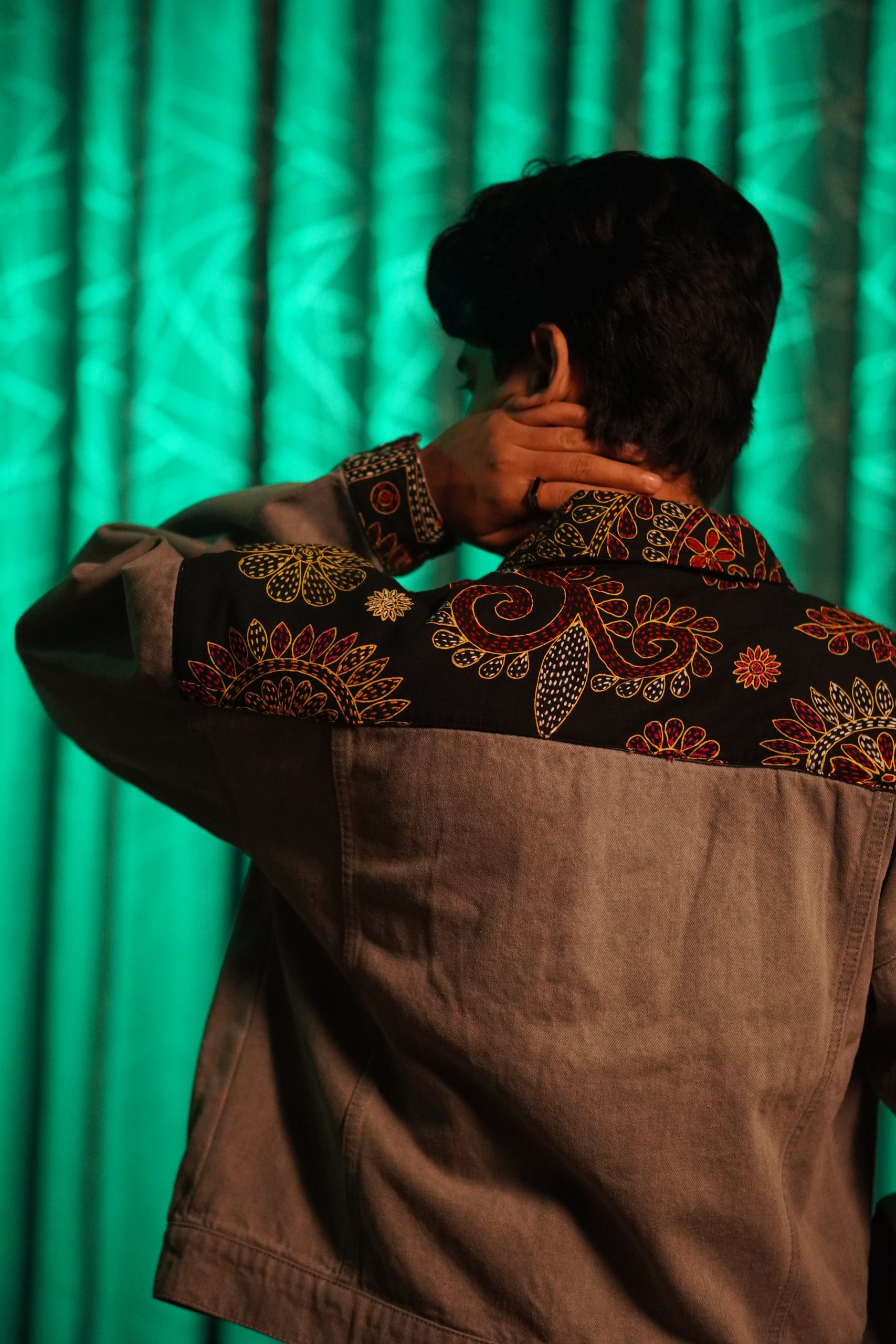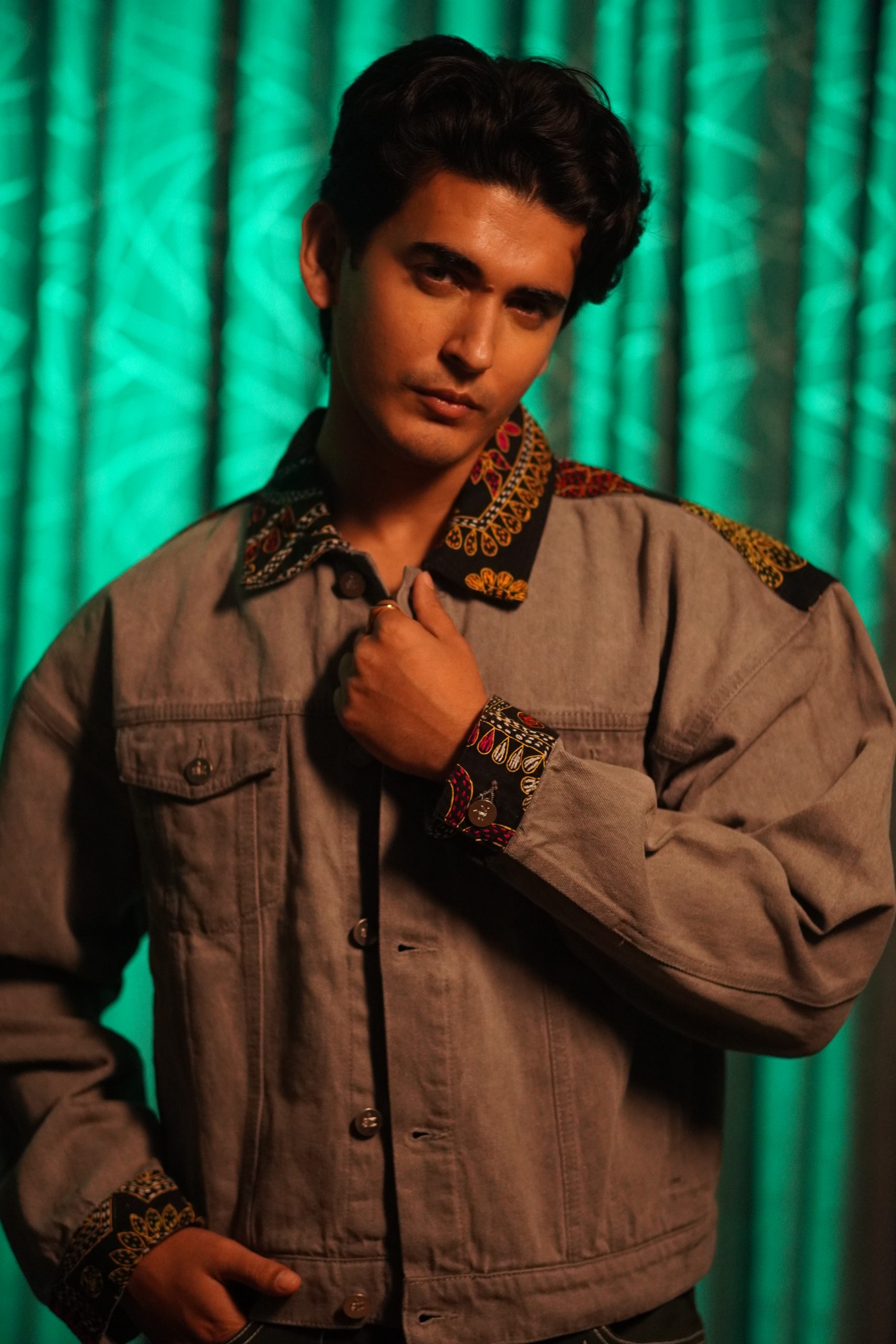 Gray jacket with black Nokshi details.