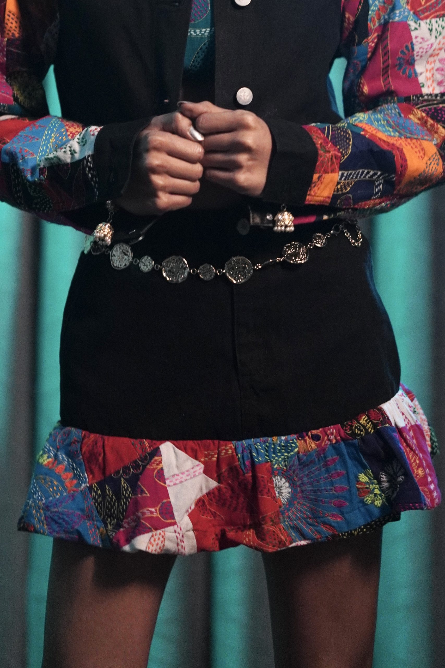 This black mini skirt has a patchwork Nokshi Katha border.