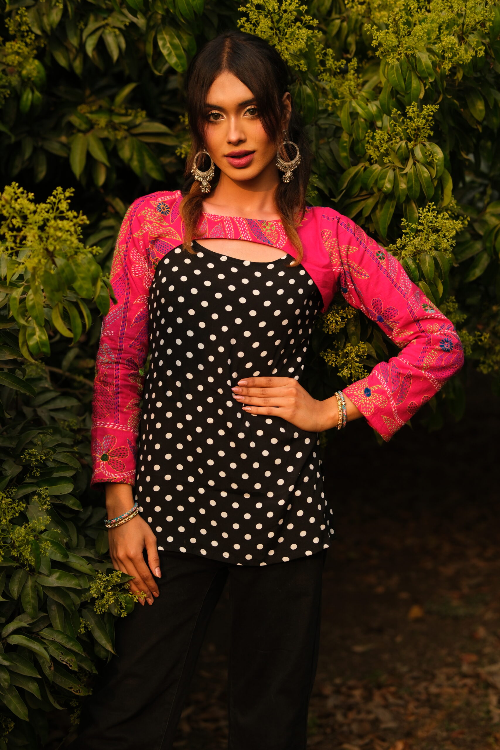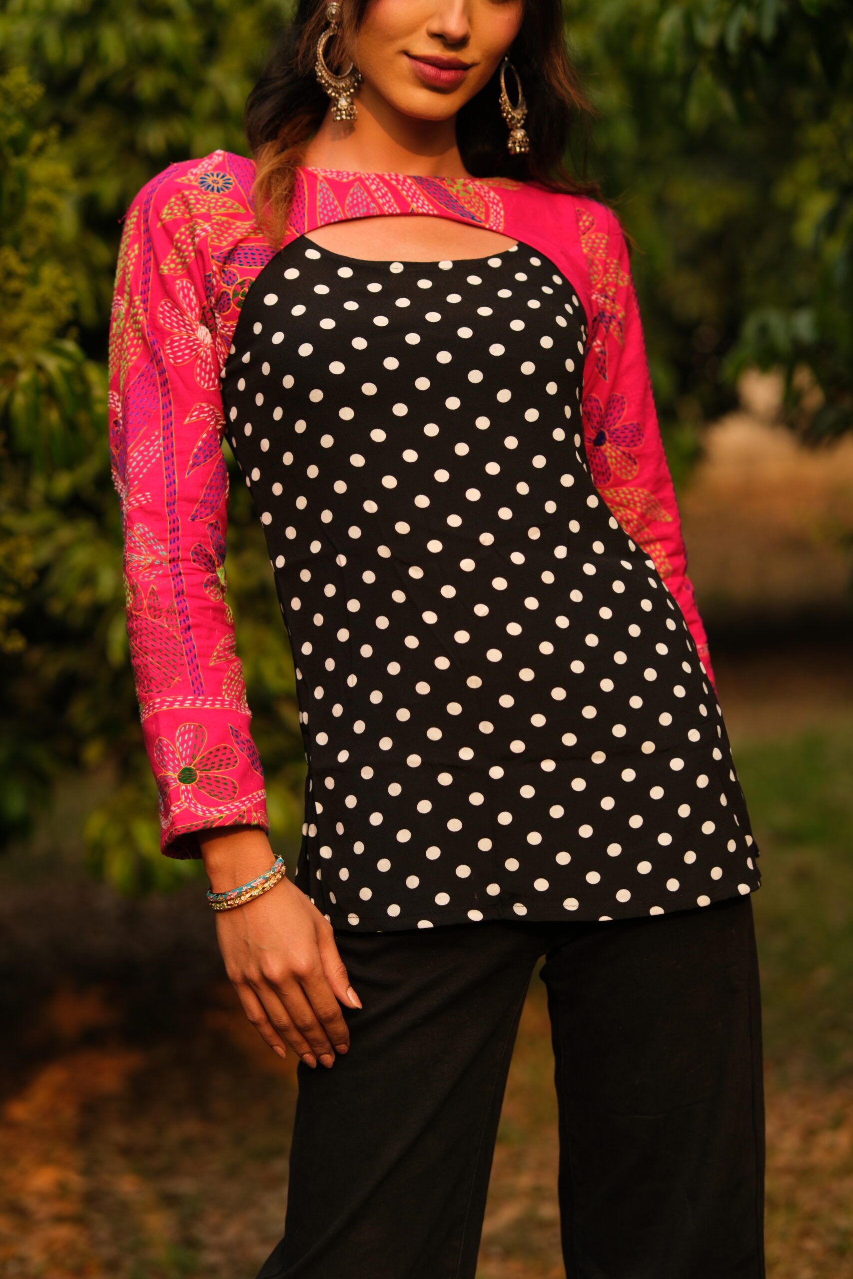 This set consists of two pieces, the polka dot top and a separate nokshi sleeve. The nokshi sleeve can be customised in different colours.